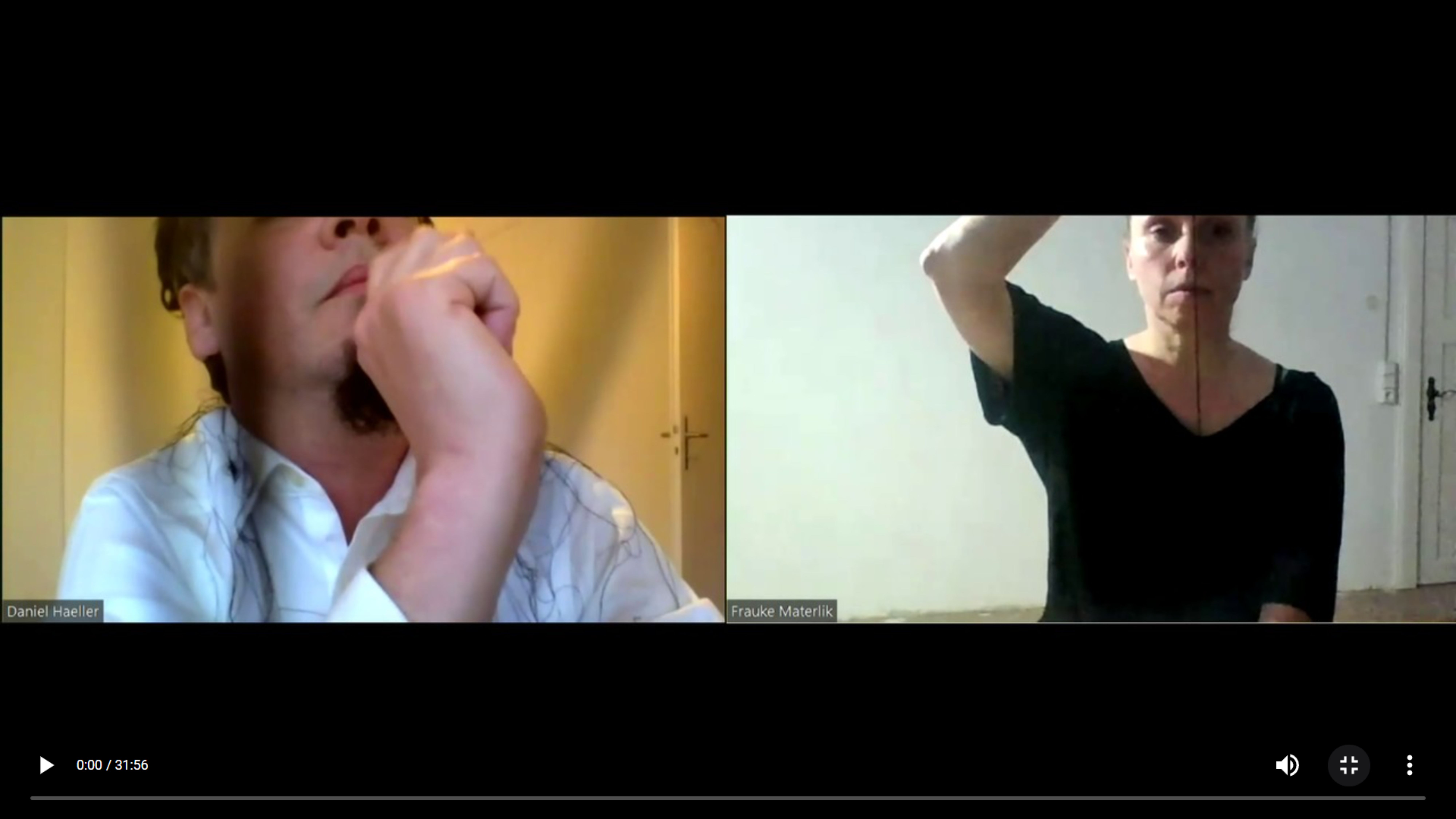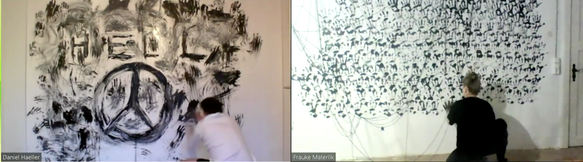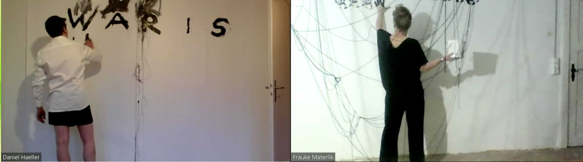 Bei unseren Vorbereitungen haben wir über Kontinuitäten, Unterbrechungen und durchgehende Linien gesprochen. Vor kurzem wurden 200‘000 Jahre alte Fingerabdrücke entdeckt, Höhlenmalereien, die von Kindern in der Region Tibet angefertigt wurden. Trotz aller Nachrichten und turbulenter Weltlage gibt es doch immer eine gewisse Kontinuität, die sich geradezu tröstlich anfühlt. Schon sehr früh haben wir uns darauf geeinigt, Schnur zu verwenden. Sie stellt eine Verbindung her, eine Linie von einem Bildschirm zum anderen und wird aber gleichzeitig zu einem Hindernis und einer Verstrickung. Der Gebrauch der Hand war ein eigenes Thema. Linien in der Handfläche, Hände die sich ausstrecken, Formen gestalten, sich am Rand der Bildschirme verbinden aber auch ein ziemliches Durcheinander verursachen. Wir wollten unsere Stimme als Möglichkeit nutzen, um Nähe zu schaffen. Den Anderen trotz kilometerweiter Entfernung, wenn auch nur digital, nah wahrzunehmen.
